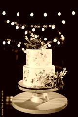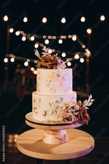 Wedding. White cake stands on a wooden stand against the background of evening lights