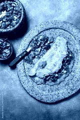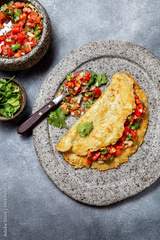 Big potato pancake with tomato sauce salsa on gray plate, gray background, top view