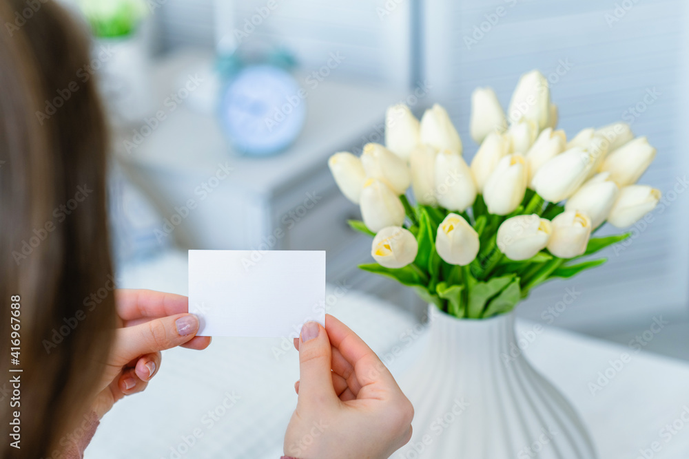 Woman pulling blank greeting card from bouquet of white tulips flowers. Copy space. Mock up