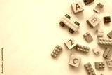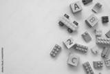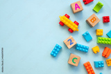 Top view of colorful bricks with toys on blue table background. Figures and alphabet signs. Education concept