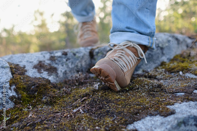 Close up view on male leg stretching ankle. Painful injury during hiking