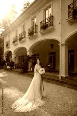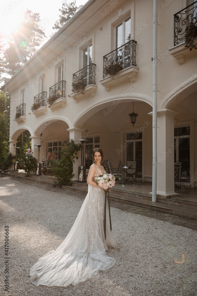 Young bride in fashionable lace wedding dress posing with bridal bouquet outdoors near the villa