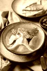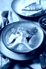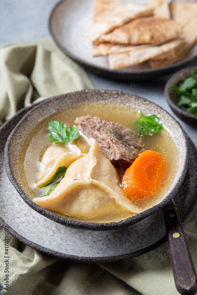 Traditional Jewish food dumplingd kreplach soup in gray bowl.