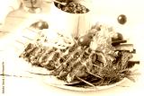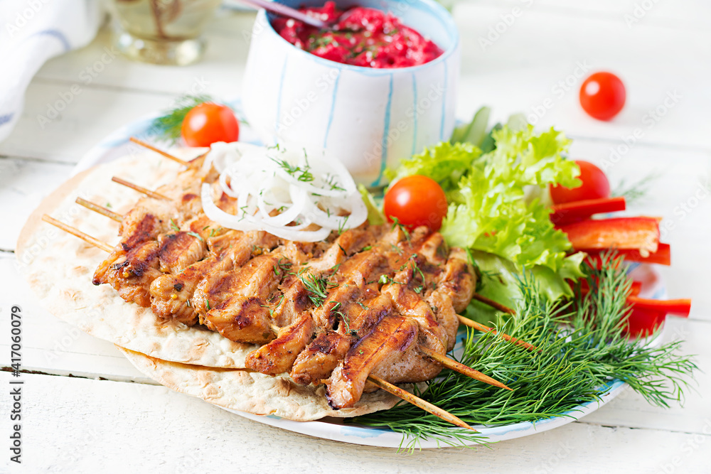 Grilled chicken kebab with beet hummus and pita, fresh vegetables on a white table. Grilled meat skewers, shish kebab on white background.
