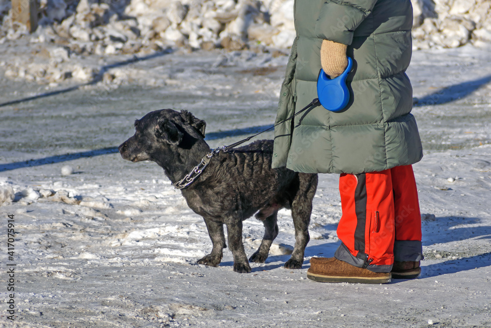 A dog and its owner are waiting for a traffic light permit sign on a sunny winter day