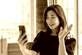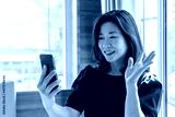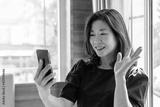 Video call on facetime zoom meeting at home in new normal lifestyle for social distancing during covid-19 lock down with woman user waves hand greeting on mobile smartphone call using social media app