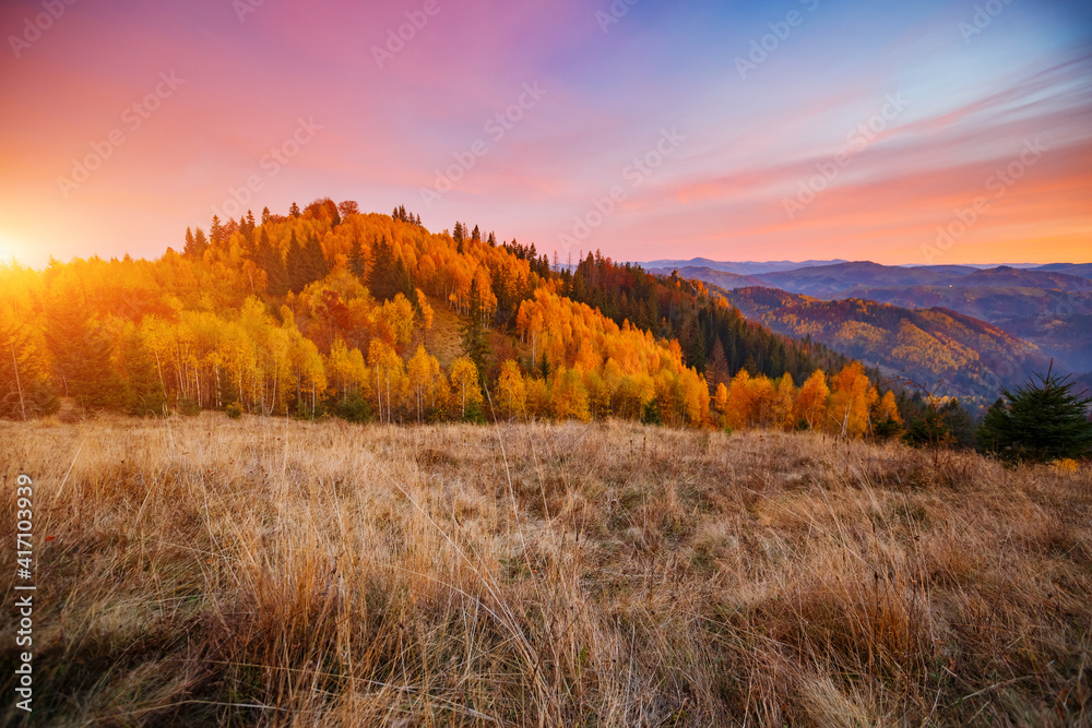 Splendid sunset in the autumn alpine highlands. Location place Carpathian mountains, Ukraine, Europe.