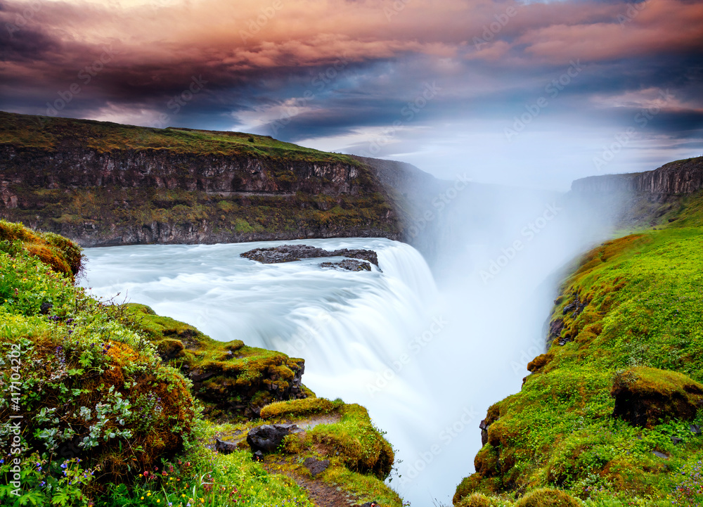 Dramatic view of the powerful Gullfoss waterfall. Location place canyon of the Hvita river, Iceland, Europe.