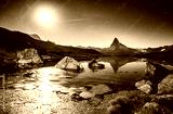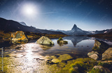 Famous peak Matterhorn (Cervino) under the starry sky. Location place Stellisee, Switzerland, Swiss alps, Europe.