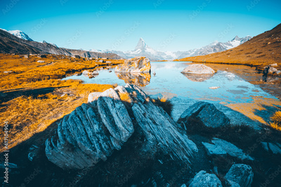 Famous peak Matterhorn (Cervino) in sunny day. Location place Stellisee, Switzerland, Swiss alps, Europe.