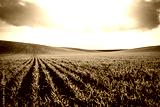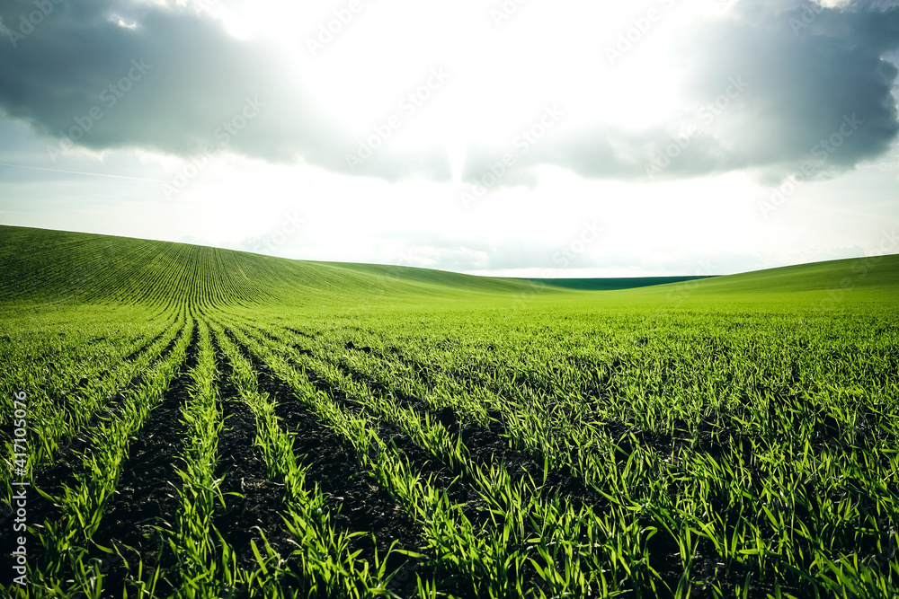 Rows of fresh green wheat in sunshine. Location place in Ukraine, Europe.