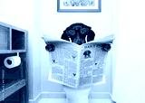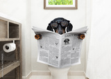 dog on toilet seat reading newspaper