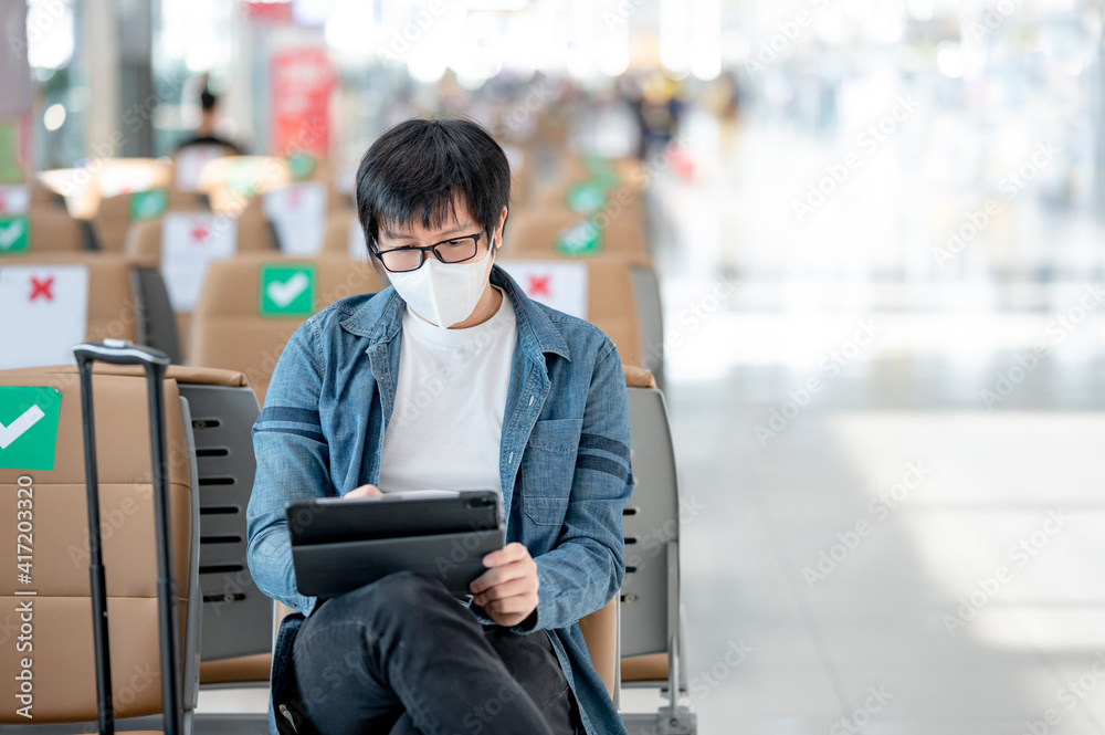 Asian man tourist with suitcase luggage wearing face mask using digital tablet in airport terminal. Coronavirus (COVID-19) prevention when travel abroad. Health awareness and social distancing concept