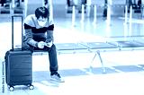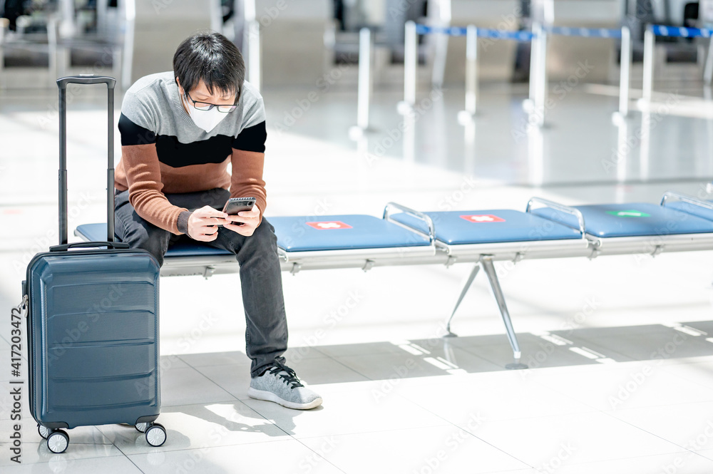 Asian man tourist with suitcase luggage wearing face mask using smartphone in airport terminal. Coronavirus (COVID-19) pandemic prevention when travel abroad. Health awareness and social distancing