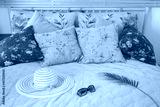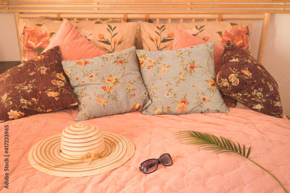 Elegant women's hat and sunglasses lying on a stylish bed. Warm light. Beautiful morning, tropical vacation, luxury and rest concept