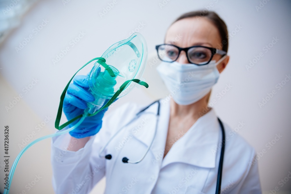 Close-up of a doctor's hand holding an oxygen mask. Saving a life.