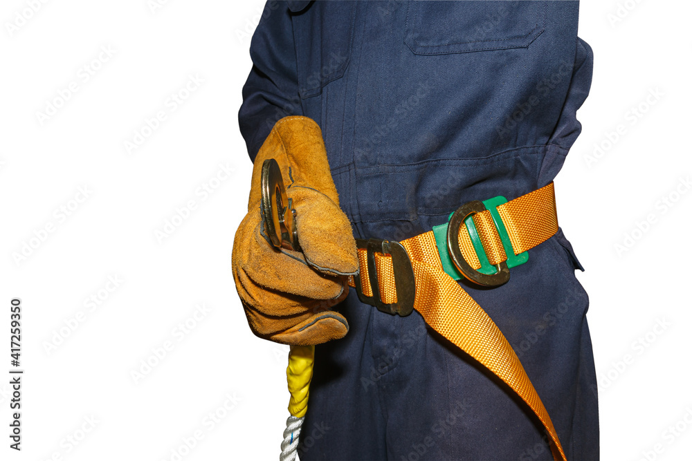 Worker wear straps Safety equipment Protection in working at heights ,On white background