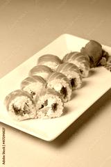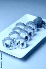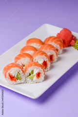 Maki Sushi - Roll made of smoked salmon and cream cheese. Traditional Japanese cuisine concept, over purple background.