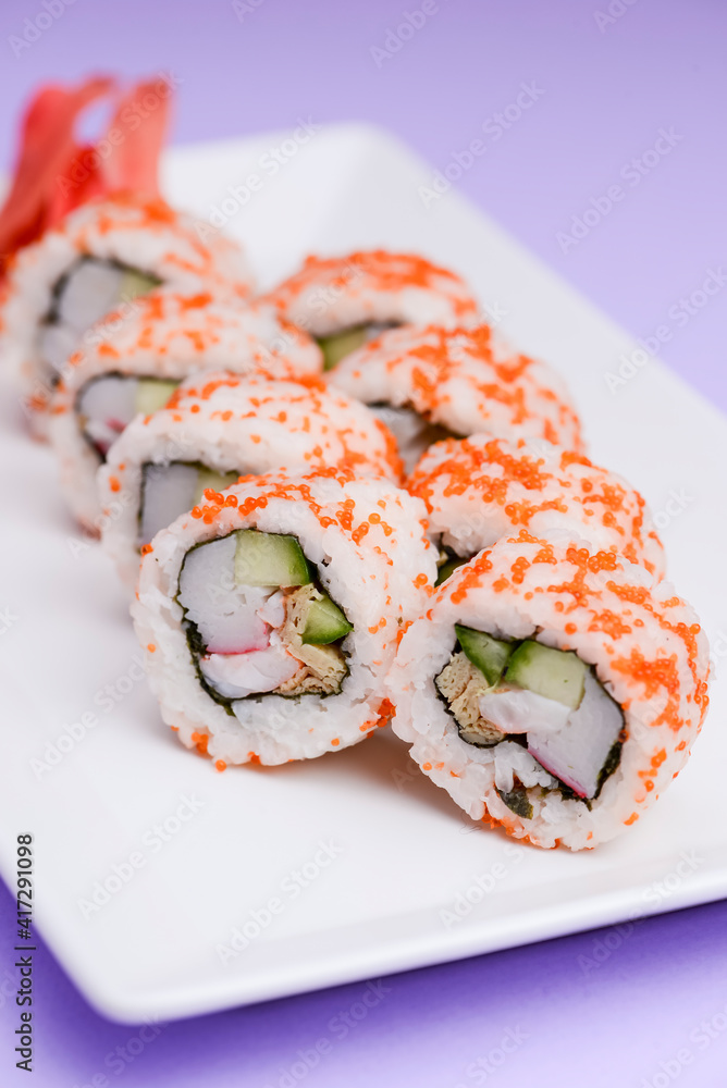 Maki Sushi - Roll made of smoked salmon and cream cheese. Traditional Japanese cuisine concept, over purple background.