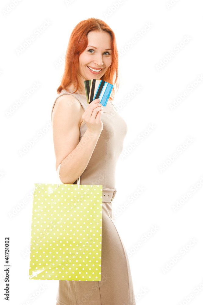 Woman with credit cards and shopping.