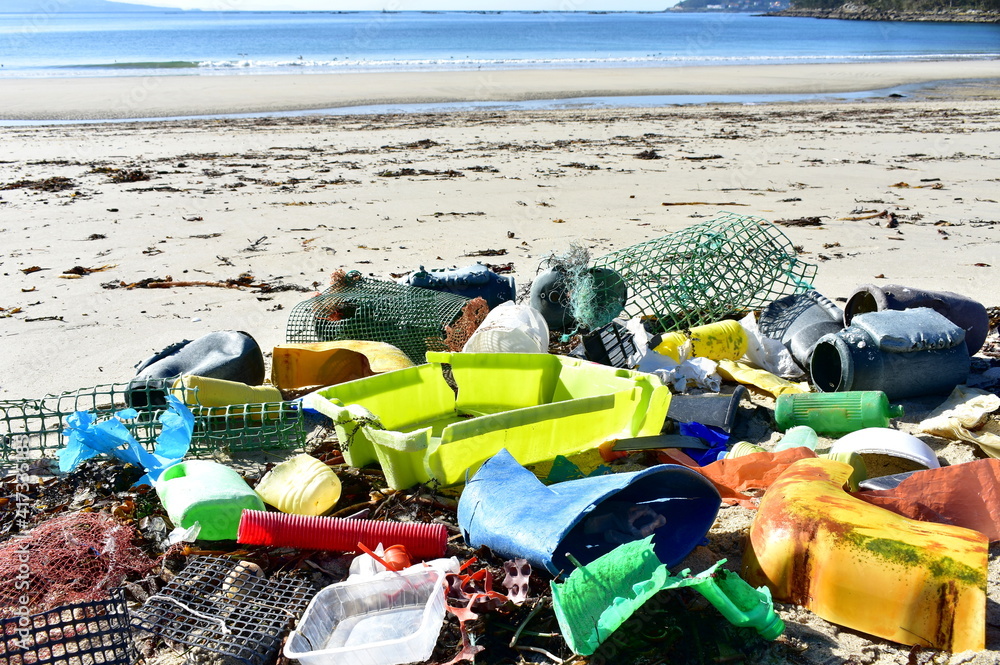 Beach with plastic pollution on sand at famous Rias Baixas Region. Galicia, Spain.