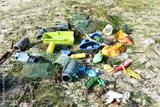 Beach with plastic pollution on sand at famous Rias Baixas Region. Galicia, Spain.