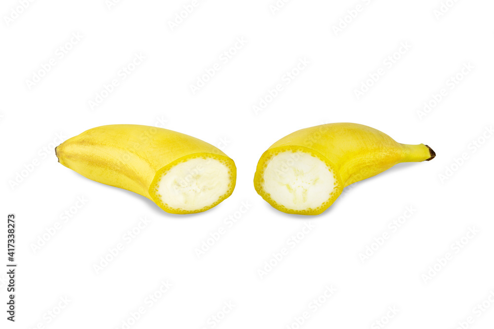 Ripe yellow banana cut in half. Isolated on white background.