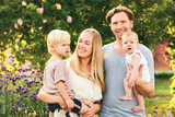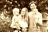 Happy young family with baby girl and toddler boy enjoying nice day in summer garden