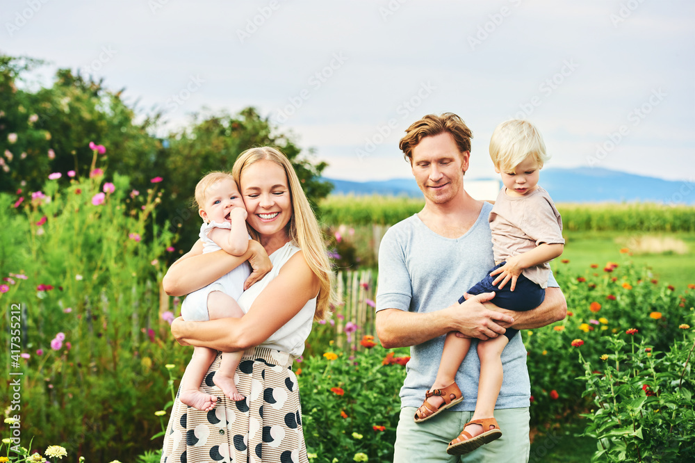 Happy young lovely family with small kids enjoing nice day in summer park or garden with blooming flowers