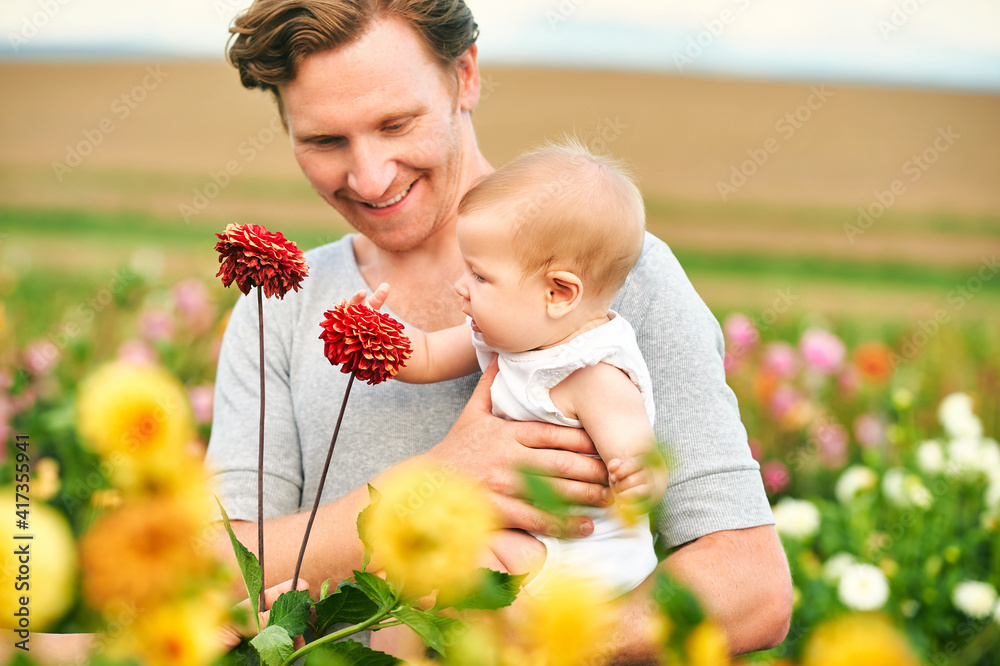 Happy young father playing with baby in beautiful flower garden, family lifestyle