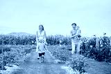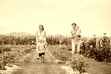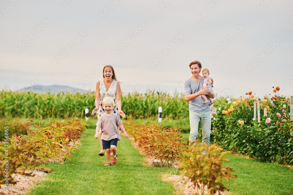 Happy young family with baby girl and toddler boy playing together on flower farm