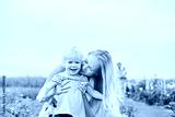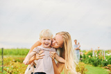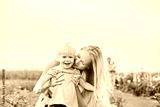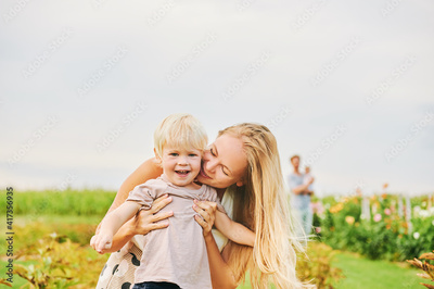 Outdoor portrait of happy young mother playing with toddler son in garden, family lifestyle