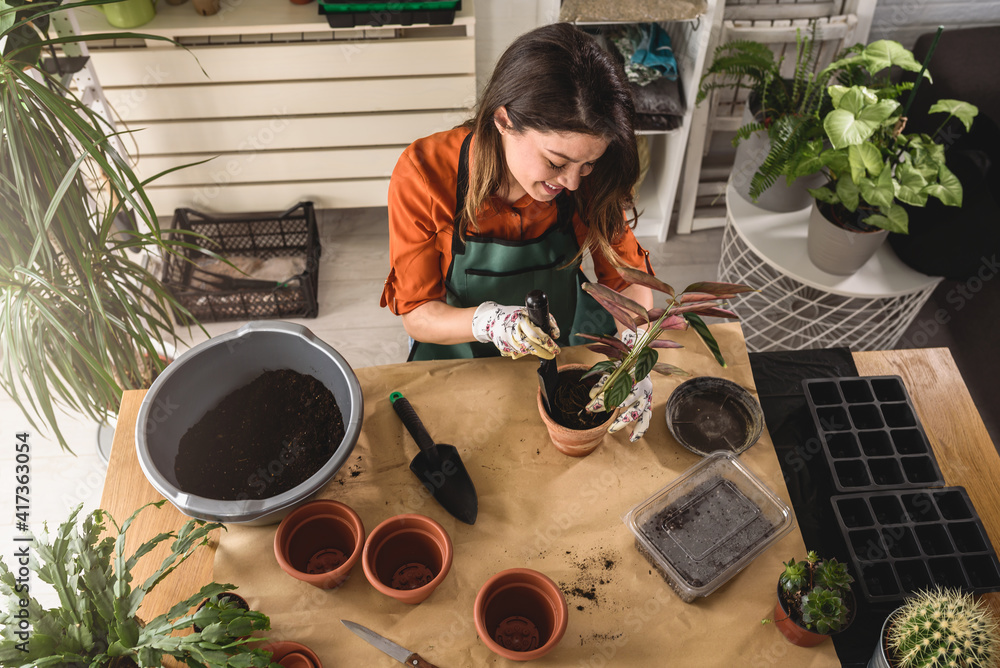 Young woman potting a plant at home. Engaging leisure activities. Indoor gardening.