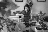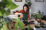 Happy young woman enjoys time at her home garden filling seed trays with potting soil. Seed-starting plants in the winter and early spring.