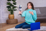 A beautiful, young girl communicates with friends in an online conference using a phone and a laptop..Quarantine Distance Learning