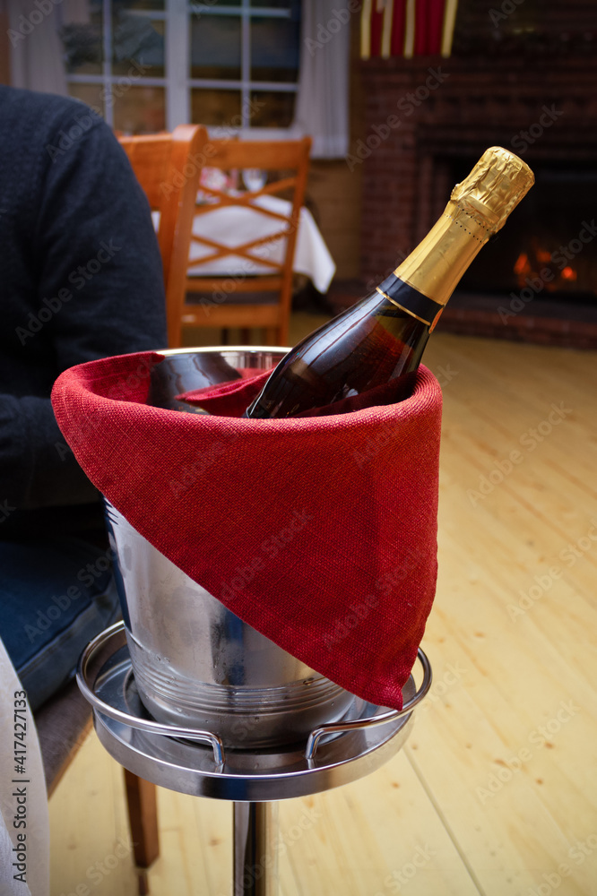 Bottle of champagne in metal ice bucket with red towel on stand in interior of restaurant