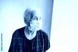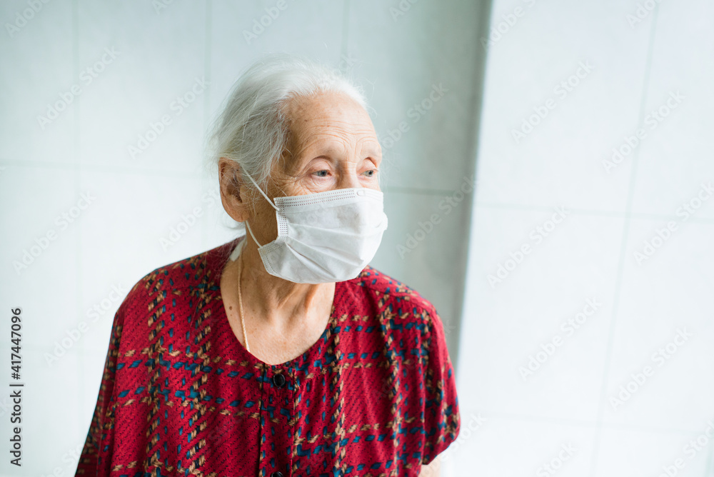 an elderly woman with gray hair 70-80 years old in a medical mask alone in the room stands at the window. Quarantine, coronavirus, stay at home, covid-19, risk group.