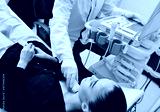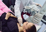 a doctor in a modern diagnostic clinic examines the thyroid gland of a patient of a young attractive woman on an ultrasound machine. Prevention of thyroid cancer.