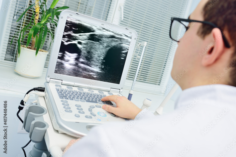 the doctor examines the result of an ultrasound examination of the thyroid gland on the monitor.