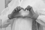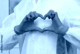 close-up of the heart from the doctor's hands in blue rubber gloves.