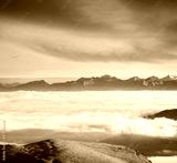 Morning view of the alpine valley in fog. Location place Seceda peak, Dolomite alps, Italy, Europe.