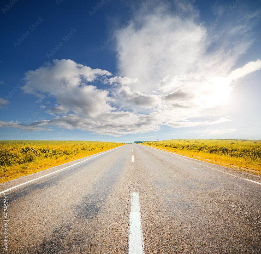 Driving on an empty asphalt road in the countryside with cloudy sky. Location place Ukraine, Europe.