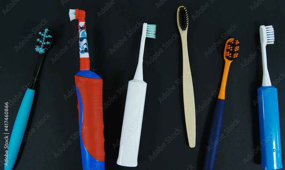 Different types of toothbrushes on a black background. Electric, eco and regular toothbrushes. Dental care concept