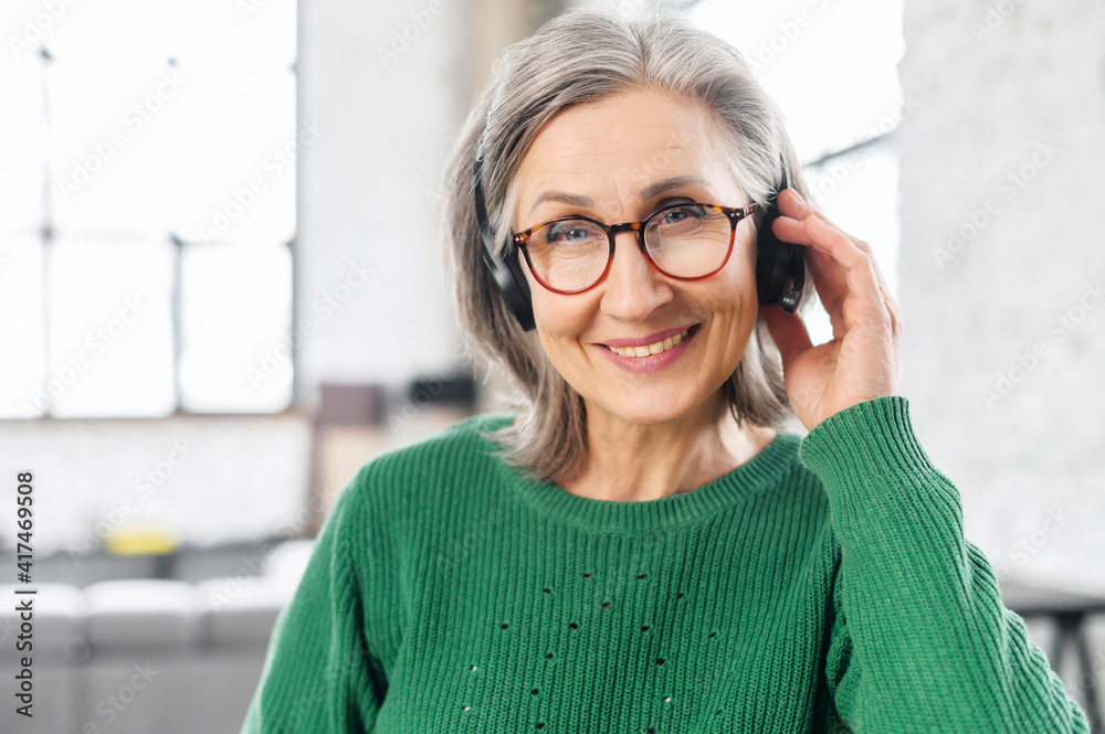 Close-up of a charming beaming elegant senior lady, wearing headset, glasses, smiling and looking at the camera. Portrait of a mature customer service representative or grandmother listening to music