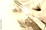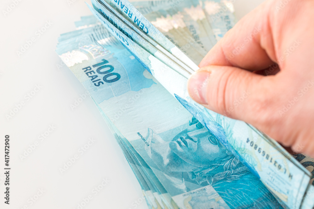 Brazilian money. Lots of 100 Real Banknotes, Counting, Economic Concept