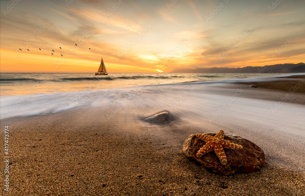 Sunset Sailboat Surreal Ocean Beach Fantasy