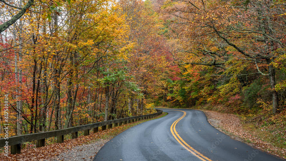 Scenic Autumn Drive on the southern portion of the Blue Ridge Parkway in North Carolina Mountains