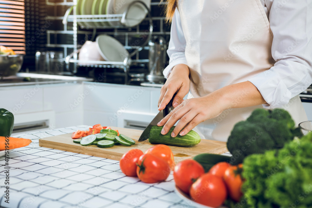 Woman using knife and hands cutting cucumber on wooden board in kitchen room.