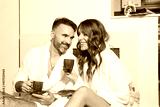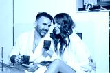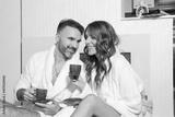 Handsome couple in bathrobe, drinking coffee in the hotel room