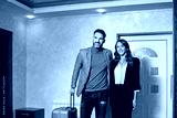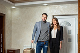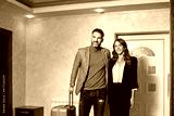 Handsome couple arriving in the hotel with bags